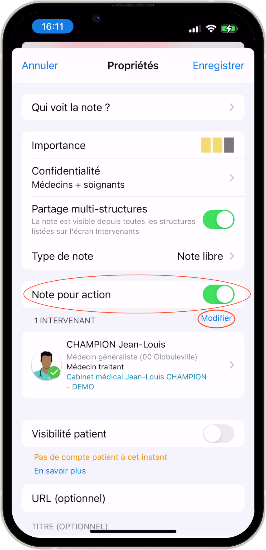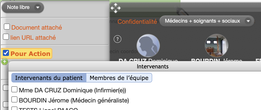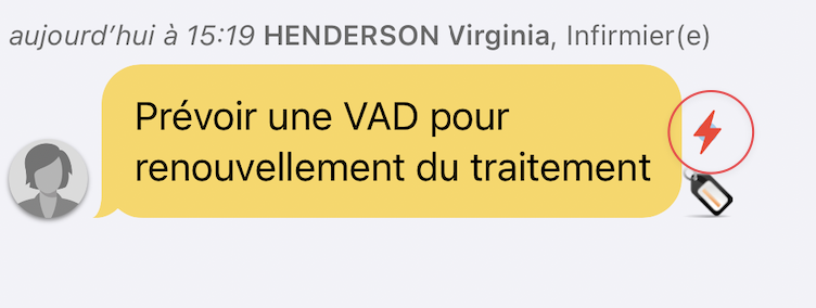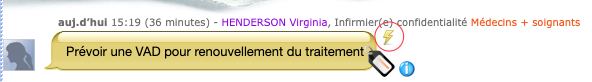Exemple : sur une note (de confidentialité "Médecins, soignants"), l'infirmière demande : "pouvez-vous prévoir le renouvellement de prescription, svp". L'intervenant ciblé pour l'action est le médecin traitant.