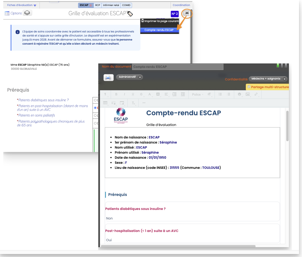 Si besoin, la grille d'inclusion peut être convertie en "Compte-rendu ESCAP" (depuis le 3 mars 2026), pour être disponible dans l'onglet "Documents" du dossier Patient (document partagé, d'importance Jaune, confidentialité 'Médecins-Soignants', classeur 'Administratif').