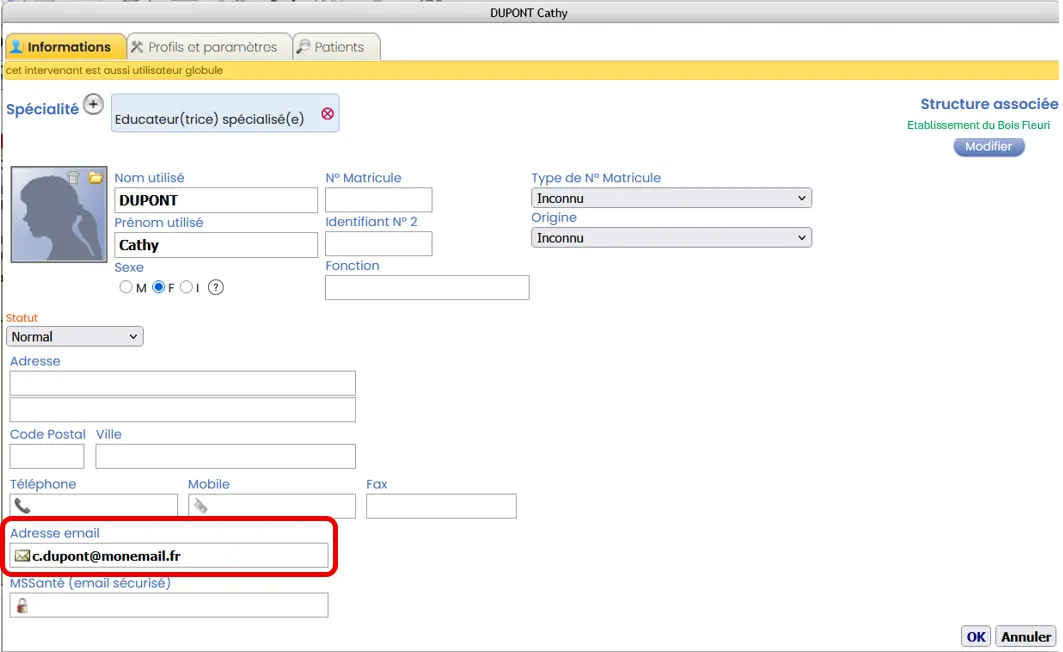 Dans l’onglet “Informations”, renseignez son email professionnel dans "Adresse email”.