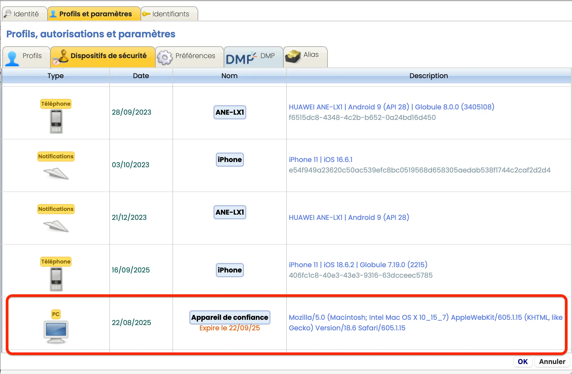 Dans la colonne "Nom", apparaît la date d'expiration de connexion. Entre la date du jour et cette date d'expiration, l'utilisateur ne devra pas saisir de code OTP. Une fois la date dépassée, l'utilisateur devra de nouveau renseigner de nouveau un code OTP qu'il recevra par mail. Une nouvelle ligne "Appareil de confiance" s'ajoutera alors dans le tableau.