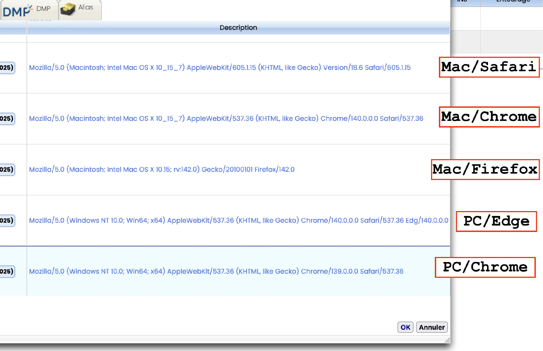 La colonne "Description" donne des détails sur l'ordinateur et le navigateur internet concerné.