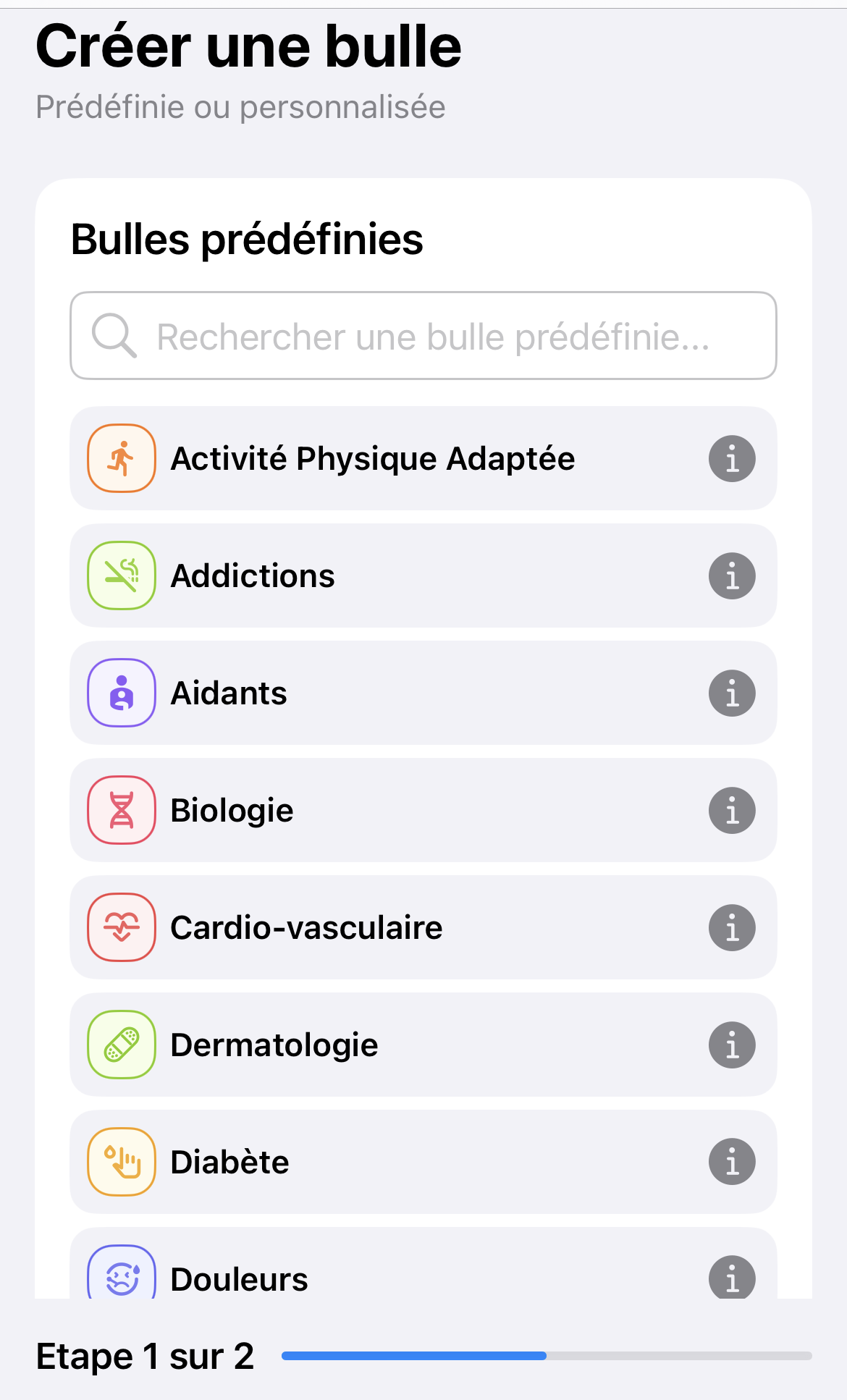 - "Disponibles" : les autres Bulles déjà créées et dont la confidentialité correspond à notre profil.