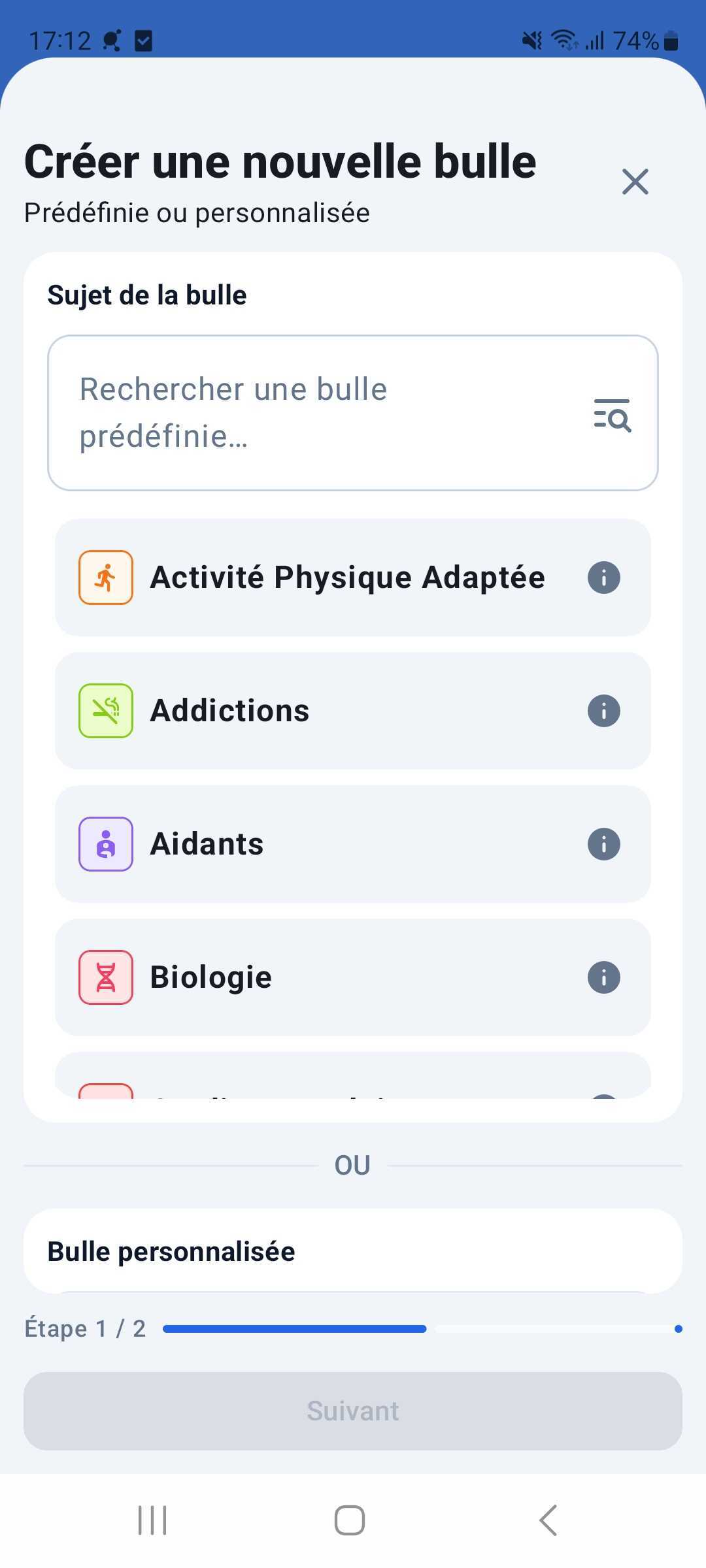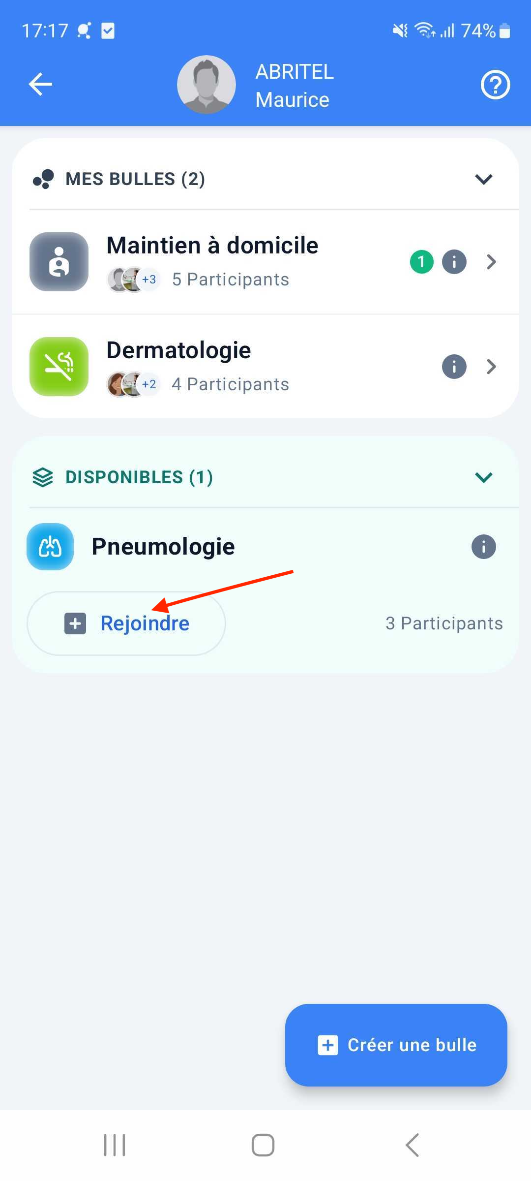 - "Disponibles" : les autres Bulles déjà créées et dont la confidentialité correspond à notre profil.